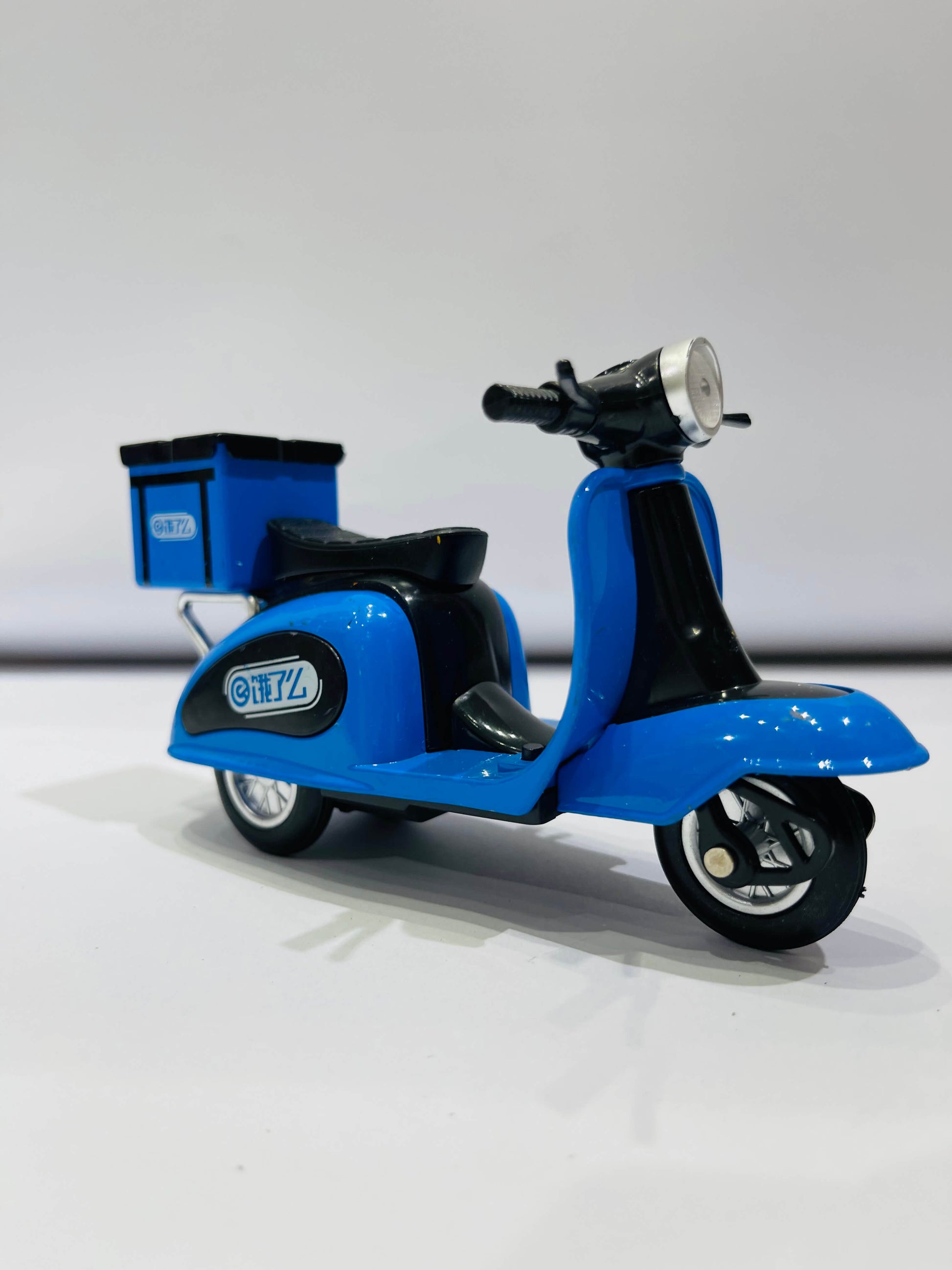 "Add a dash of charm and character with this miniature model of a blue delivery scooter, inspired by the classic urban delivery style. Featuring detailed black accents on the seat, handlebars, and front fairing, this decorative piece includes a rear-mounted black delivery box and a white '了么' (Ele.me) logo—paying homage to one of China’s leading food delivery services. Perfect as a collectible, cake topper, or playful decor for fans of city life and modern street culture..