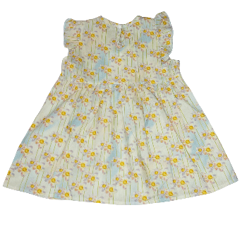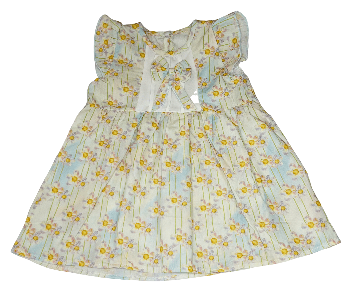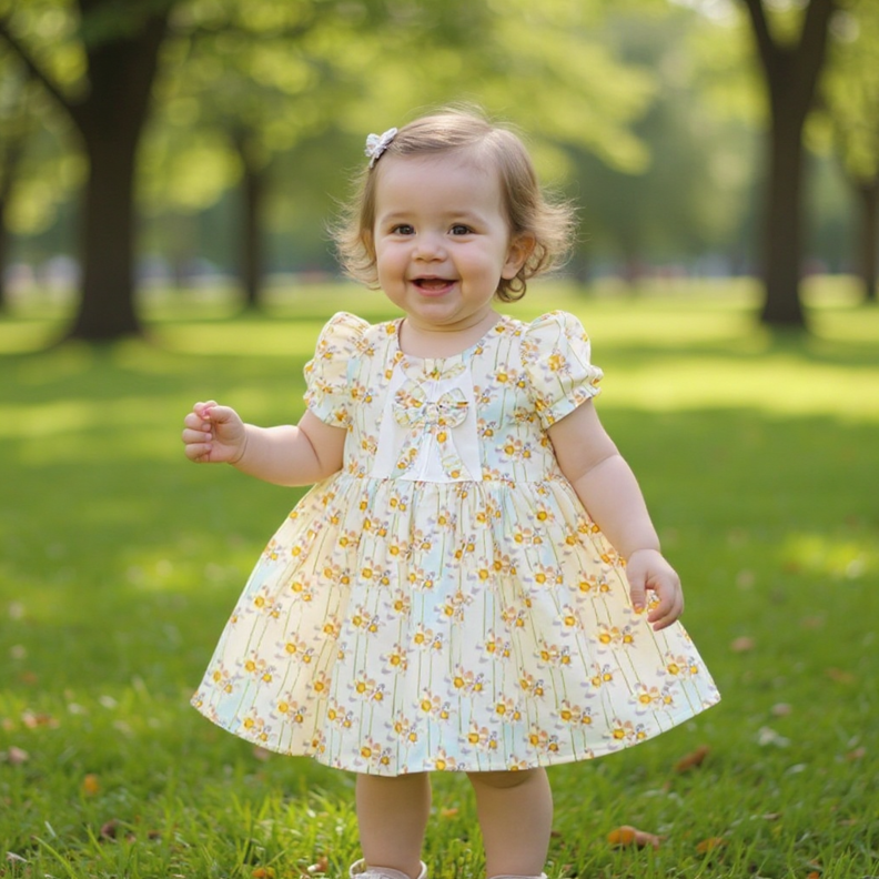 Wrap your baby girl dress with a light blue and white floral print, ruffled sleeves, and a cute white bow. Made from lightweight, breathable fabric—perfect for spring and summer.